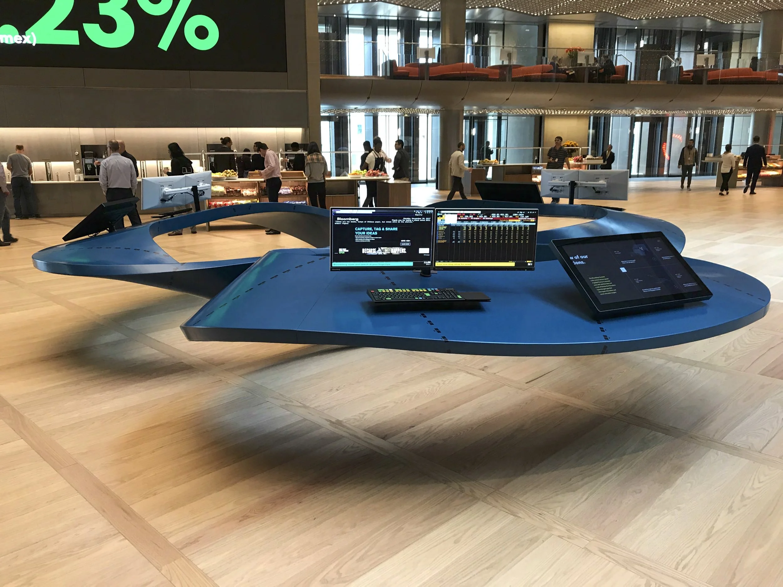 My challenge was to engineer the three 14 x 8-foot tables to cantilever out from a single center point. I designed an aluminum lattice structure that would thread through a 5-axis milled foam substrate. The structure allows data and electrical power to feed the Bloomberg terminals out on the main work surface. I relied on a composite layup of fiberglass and carbon fiber to give strength to the complicated surface.